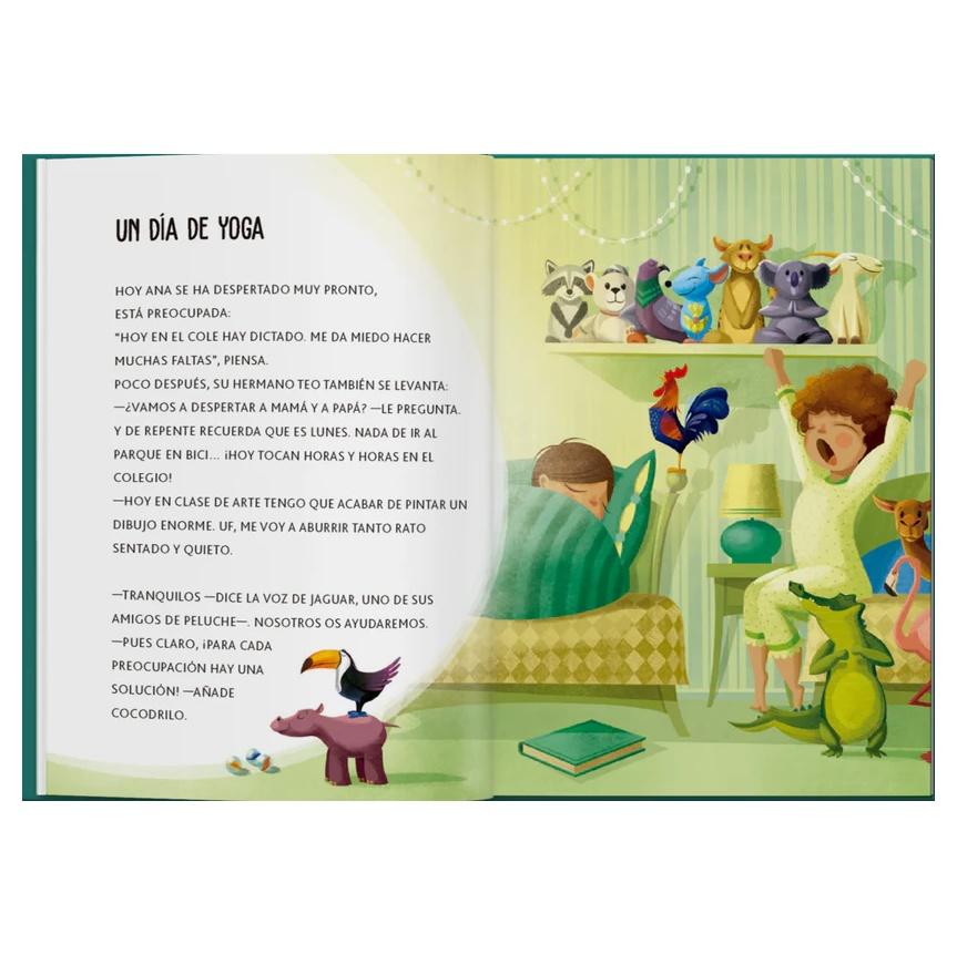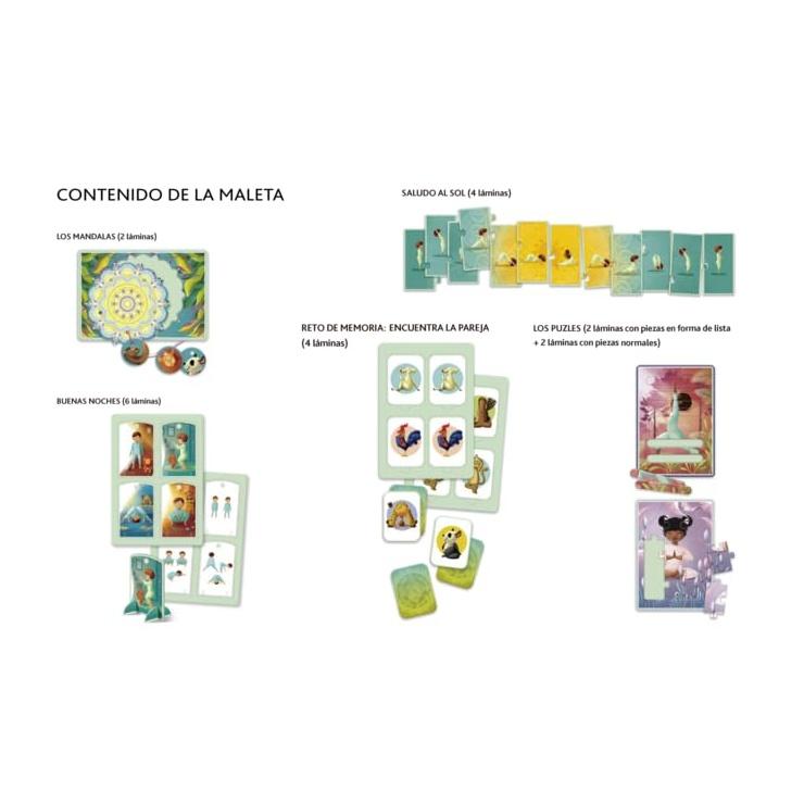 Esta maleta de viaje Incluye un libro con una historia basada en posturas de yoga y 20 tableros para diversas actividades: un juego de memoria con posiciones de yoga, 16 cartas para ordenar y crear la secuencia de correcta asanas para dormir, y mucho más. También viene con un manual de instrucciones que explica cada actividad. ¡Todo en una caja fácil de llevar de viaje!